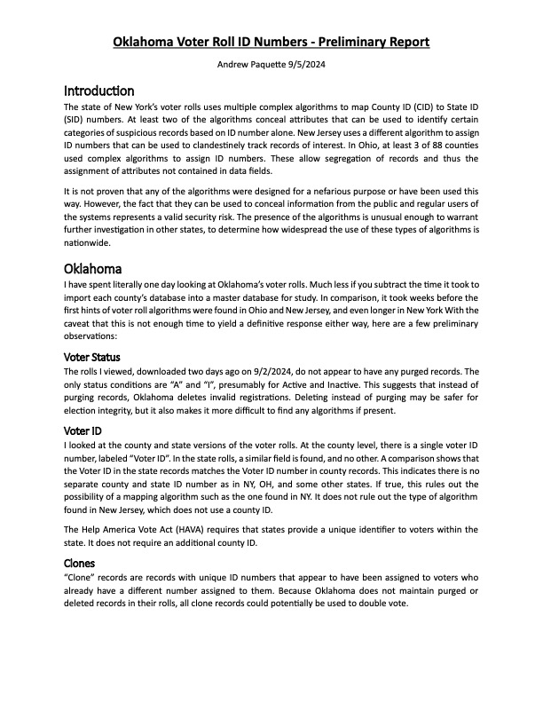 This report examines Oklahoma’s voter rolls for irregularities and potential hidden tracking mechanisms. While no definitive evidence of complex algorithms was found, preliminary analysis identified 7,057 potential cloned records(approximately 3,500 problematic registrations) and 179,598 records (7.54%) missing registration dates, violating HAVA requirements. Scatterplot analysis of voter ID numbers showed mostly expected trends but revealed breaks in sequencing in 2012 and 1990, which warrant further review. Additionally, voter registration spikes in 2016 and 2020were unusually high.